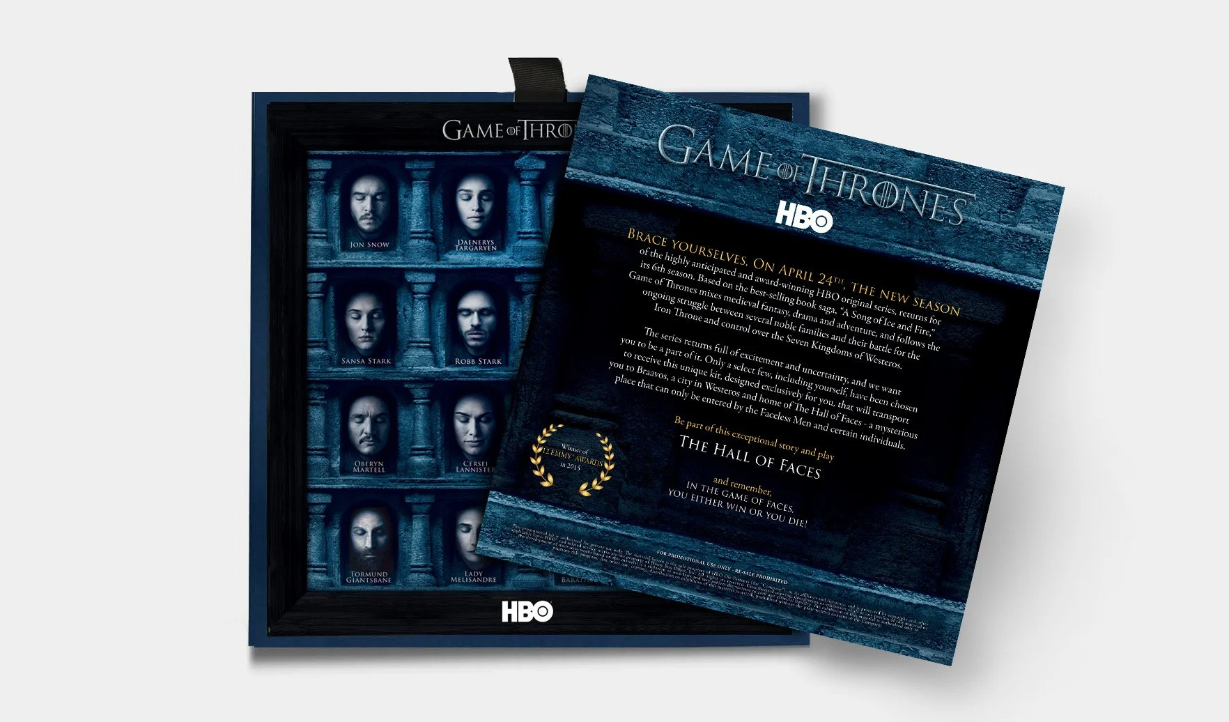 To generate intrigue and excitement around the premiere of Season 6 of Game of Thrones, we created a premium Affiliate gift – “The Hall fo Faces” game set – that brought to life one of the most memorable childhood games, “Guess Who?”.