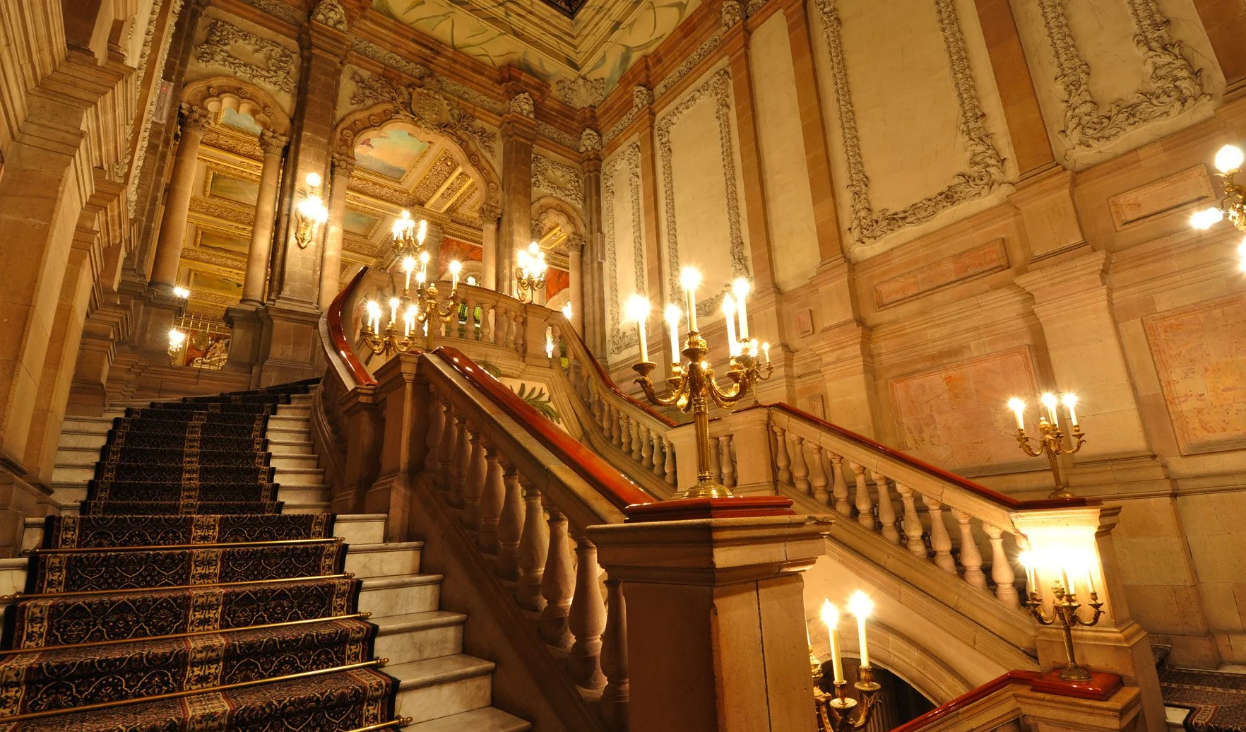 They proceeded up the white marble staircase below ornate hand-painted ceilings and arrived to its expansive main party hall.